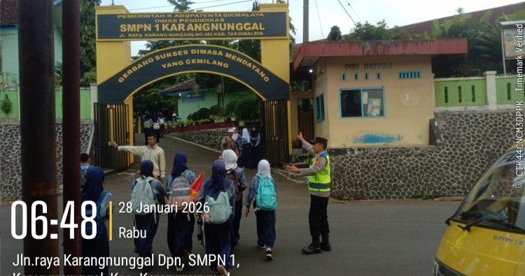 Karangnunggal – Anggota Polsek Karangnunggal melaksanakan pengaturan lalu lintas sekaligus bantu pelajar menyeberang jalan di depan SMPN 1 Karangnunggal Kecamatan Karangnunggal Kabupaten Tasikmalaya, Rabu (28/1/26).