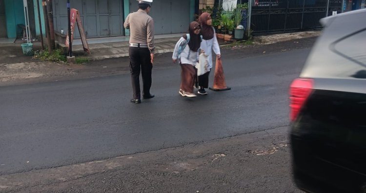 Karangnunggal – Panit 2 Lantas Polsek Karangnunggal melaksanakan pengaturan lalu lintas sekaligus bantu pelajar menyeberang jalan di depan SMPN 1 Karangnunggal Kecamatan Karangnunggal Kabupaten Tasikmalaya, Jumat (23/1/26).