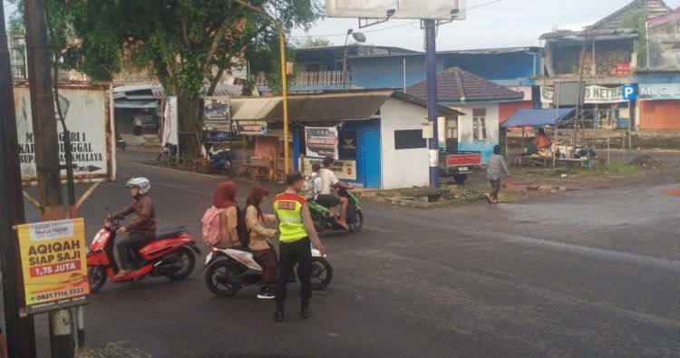 Anggota Polsek Karangnunggal melaksanakan gatur lalu lintas pagi di Perempatan Terminal Rancabakung Desa Karangmekar Kecamatan Karangnunggal Kabupaten Tasikmalaya.