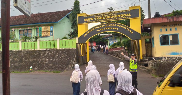 TASIKMALAYA - Suasana pagi di depan SMPN 1 Karangnunggal, Kecamatan Karangnunggal, Kabupaten Tasikmalaya, pada Selasa (23/9/25) terlihat berbeda. Di tengah hiruk pikuk aktivitas warga dan para pelajar yang bergegas memulai hari, kehadiran anggota Polsek Karangnunggal menjadi penyejuk sekaligus pengaman. Mereka tidak hanya berdiri tegak mengatur arus kendaraan, tetapi juga dengan sigap membantu para siswa menyeberang jalan, memastikan setiap langkah mereka aman dari potensi bahaya.